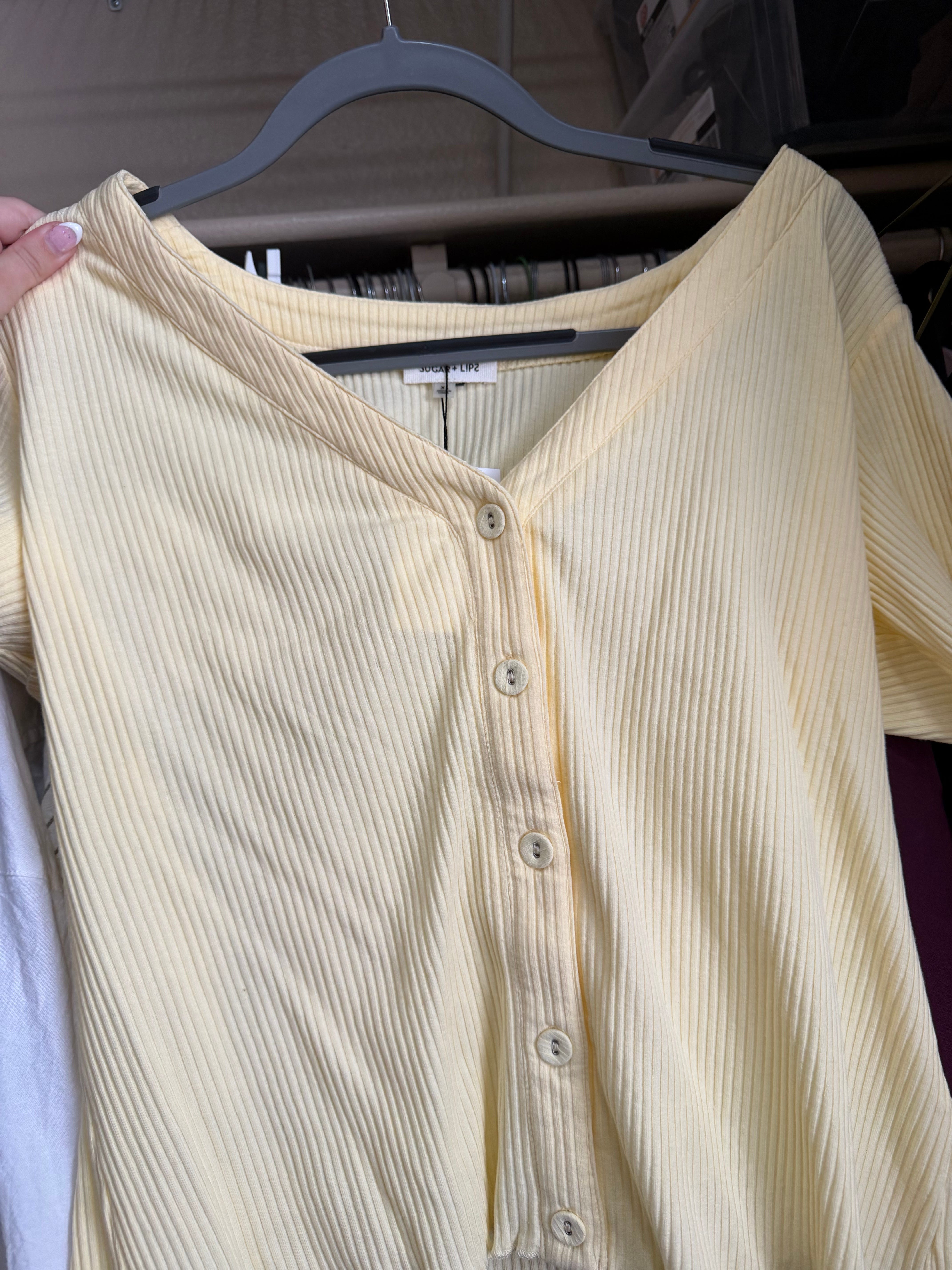 Pastel yellow ruched button-up shirt. Tag still on. One of those clothing delivery services my mom does. I love yellow, but this shade makes me look a little too pink. Thought it was a soft, quaint, girl-next-door vibe when I first tried it on, but now it looks more like I stole it from grandma’s closet. I should’ve sent it back with the other clothes, but it’s too late now. Maybe I can make it work at some point. Keep.